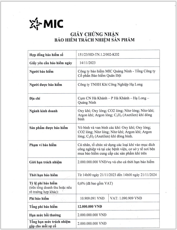 Khí công nghiệp là một ngành nghề có nhiều rủi ro về an toàn cao do chứa khí nén có ứng dụng. Vì vậy Công ty TNHH Khí công nghiệp Hạ Long luôn đặt vấn đề quyền lợi của khách hàng hàn lên hàng đầu. Đảm bảo trách nhiệm của mình khi có rủi ro xảy ra dù là nhỏ nhất. Trong quá trình hoạt động sản xuất kinh doanh, chúng tôi luôn đảm bảo có đầy đủ bảo hiểm về trách nhiệm đối với các sản phẩm mà chúng tôi cung cấp cho khách hàng của mình.
