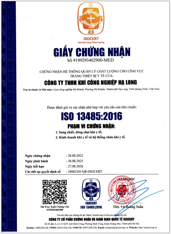 Công ty TNHH khí công nghiệp Hạ Long tự hào đã đạt được chứng chỉ ISO 13485:2016 cho cơ sở sản xuất của mình. Để đạt được điều này, chúng tôi luôn phải nỗ lực và cố gắng hết mình trong suốt nhiều năm. Và chưa dừng lại ở đó, chúng tôi sẽ luôn cố gắng để đạt được nhiều hơn thế nữa những tiêu chuẩn chất lượng trong tương lai không xa tới!